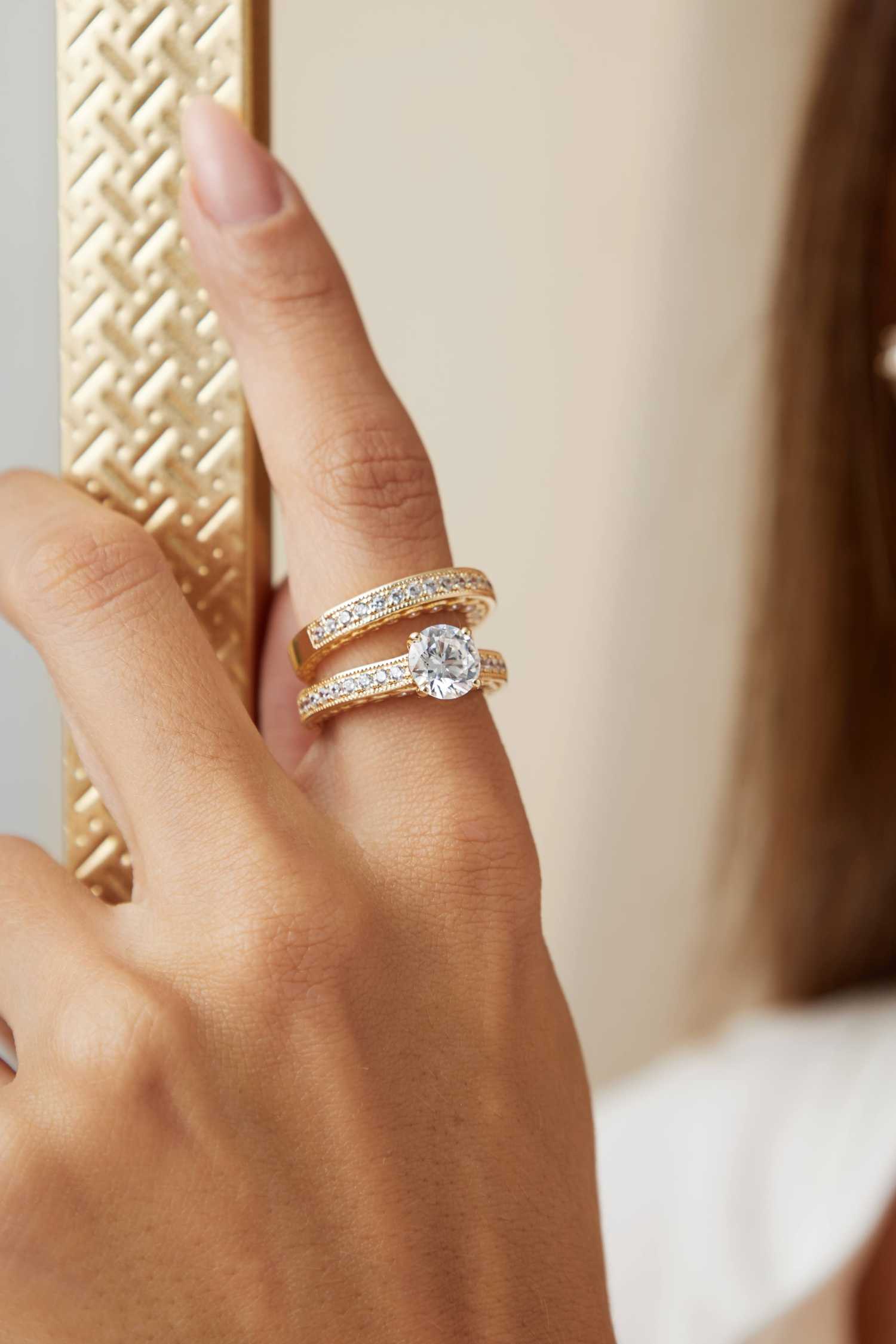 Um conjunto sofisticado que une a elegância do anel solitário à delicadeza do aparador com pontos em cravação inglesa. O solitário destaca-se como peça central, enquanto o aparador envolve a composição com brilho extra, criando um efeito refinado e atemporal