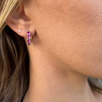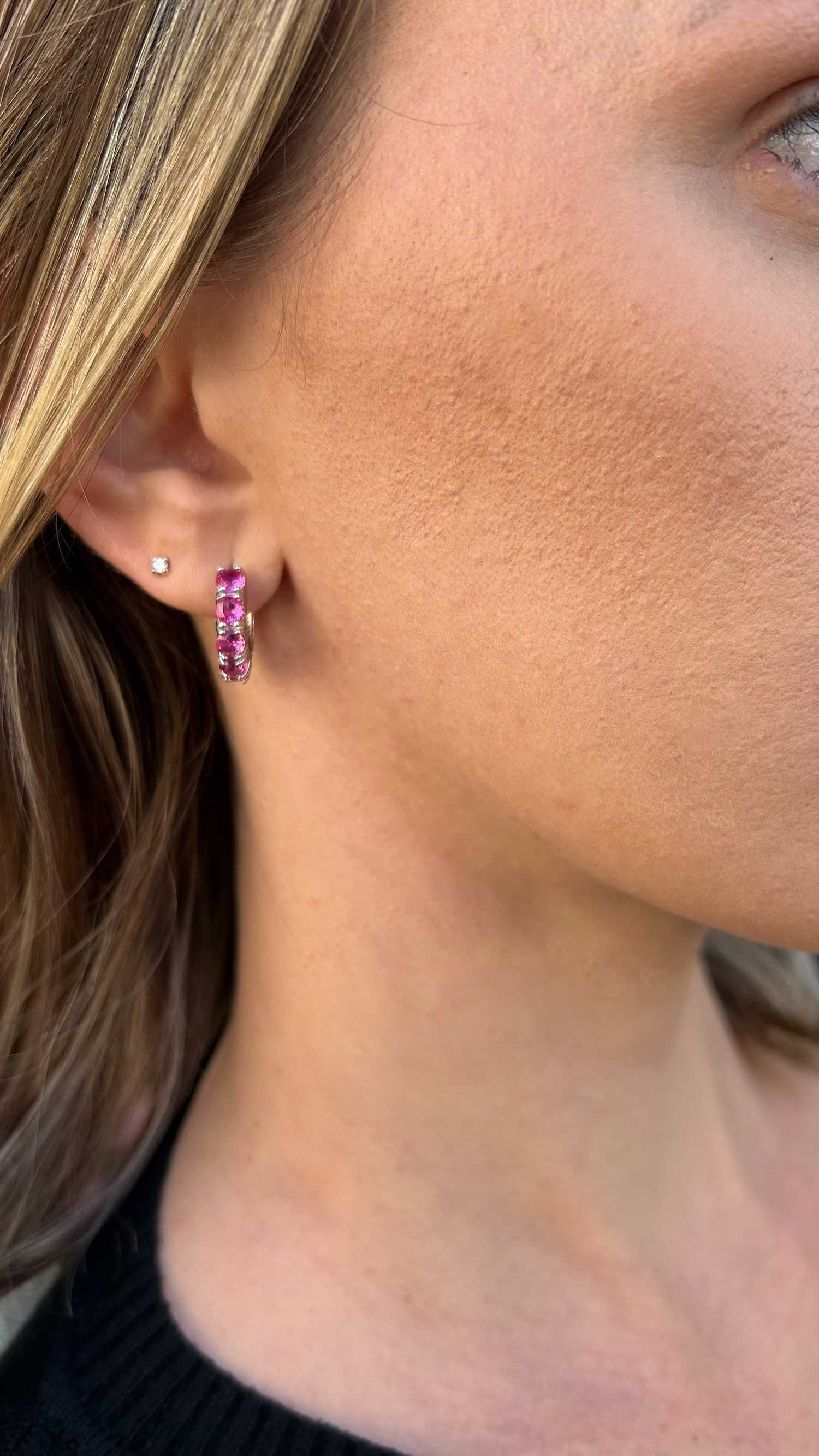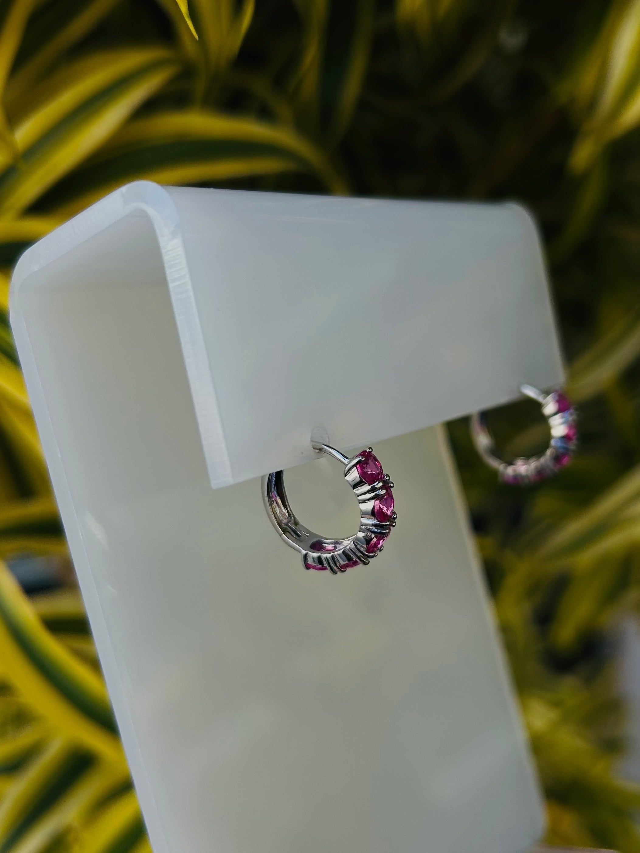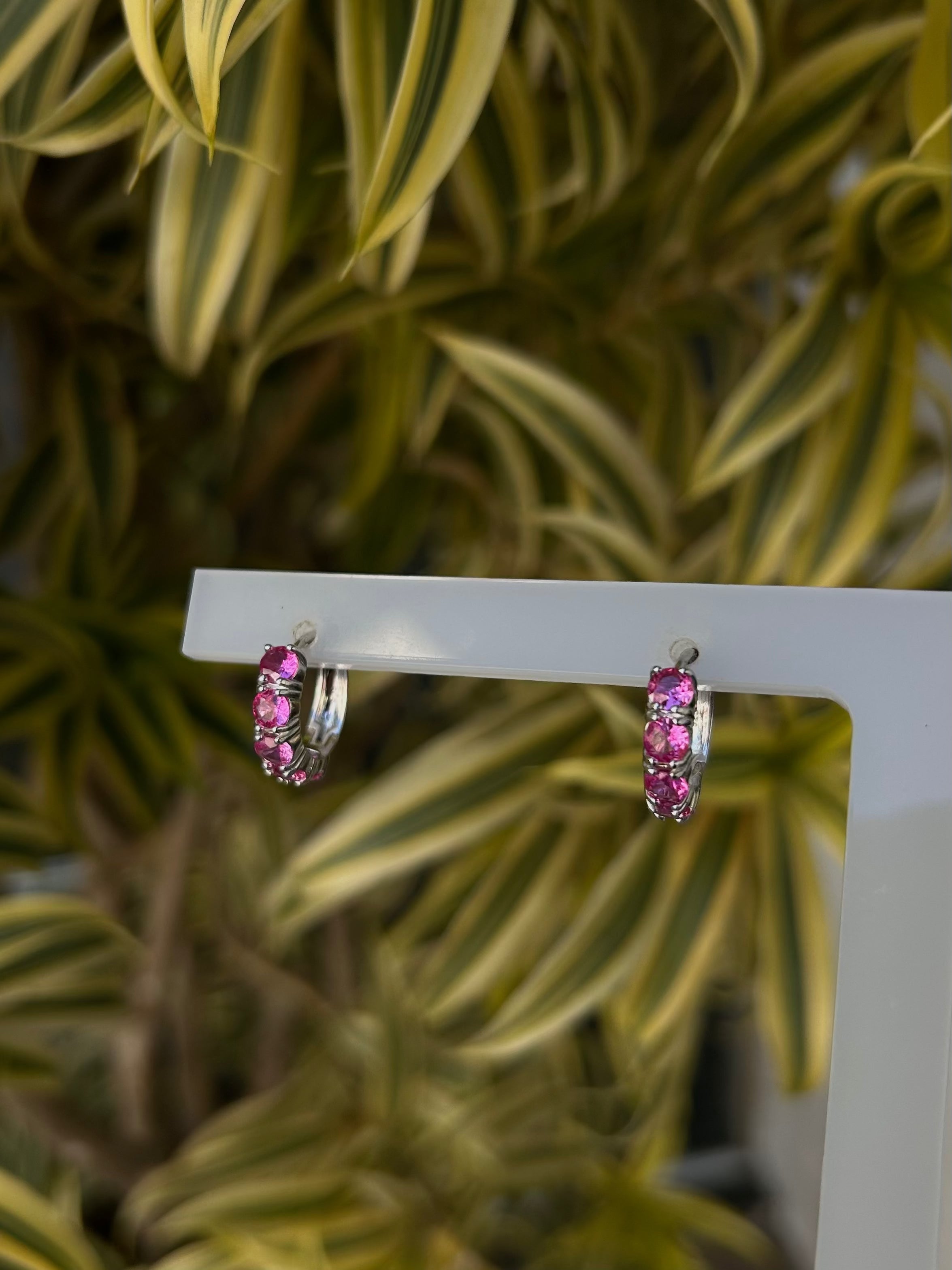 Delicadeza com um toque vibrante. Esta argola traz cinco pontos de luz em zircônias pink perfeitamente alinhadas, criando um visual leve e encantador. Um brilho feminino que destaca a beleza com suavidade.