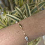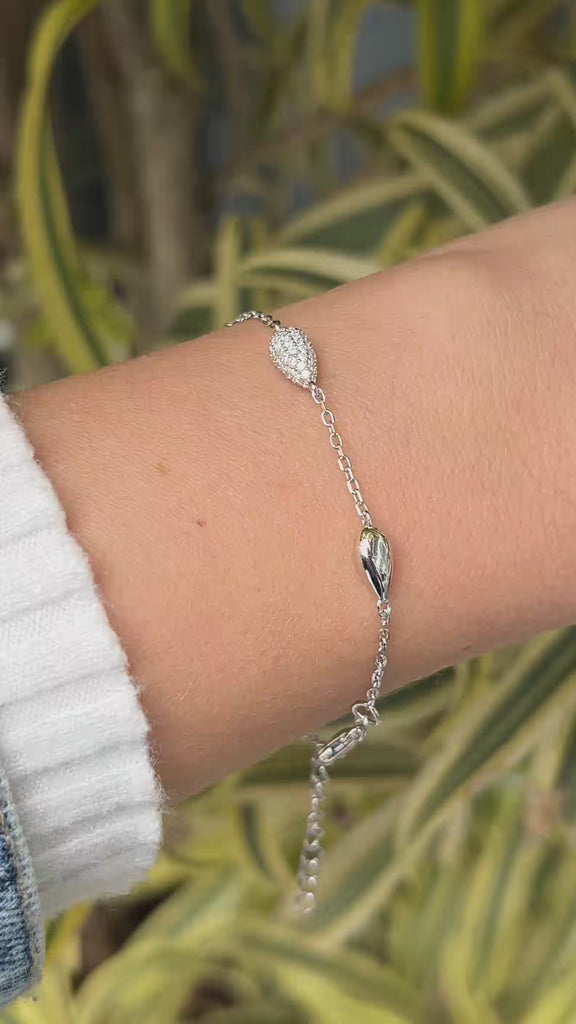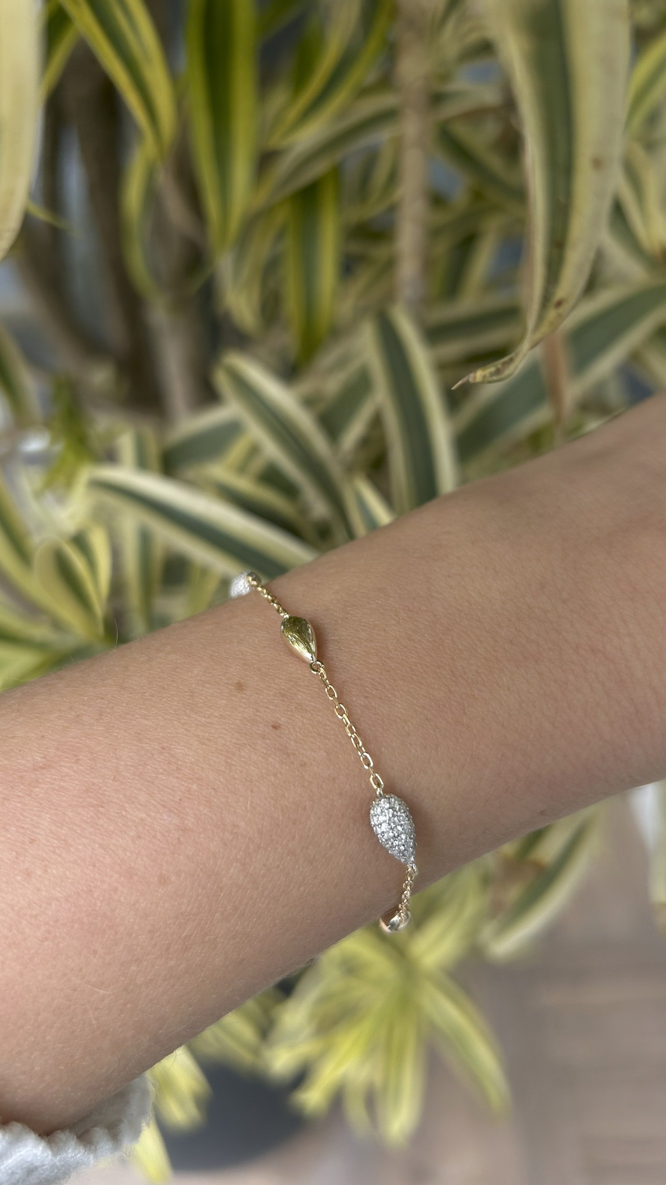 Pulseira elegante em Prata 925 com elos portugueses, adornada com gotas arredondadas cravejadas que proporcionam brilho e sofisticação. Uma peça versátil e refinada, perfeita para valorizar o pulso com estilo e feminilidade
