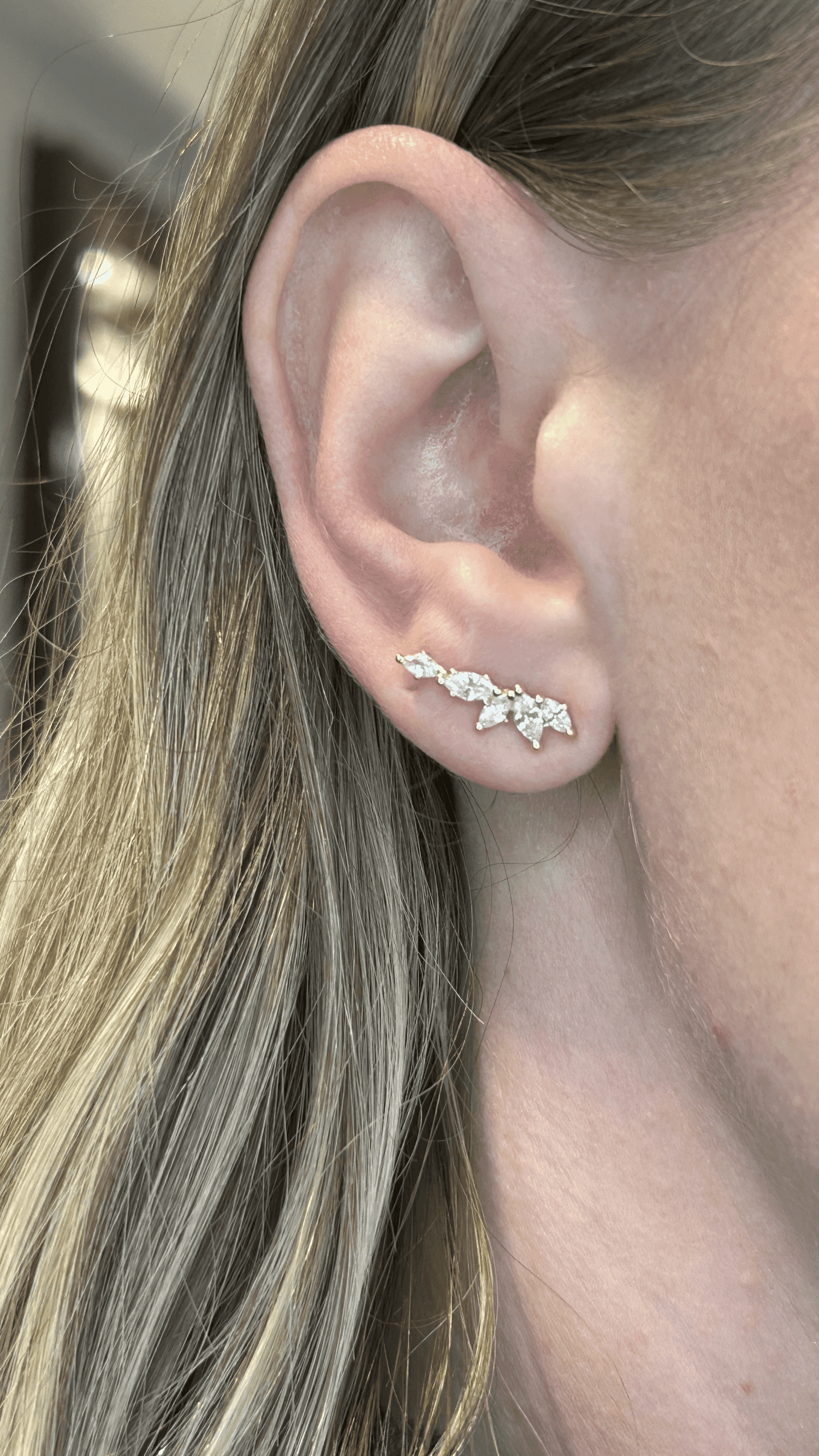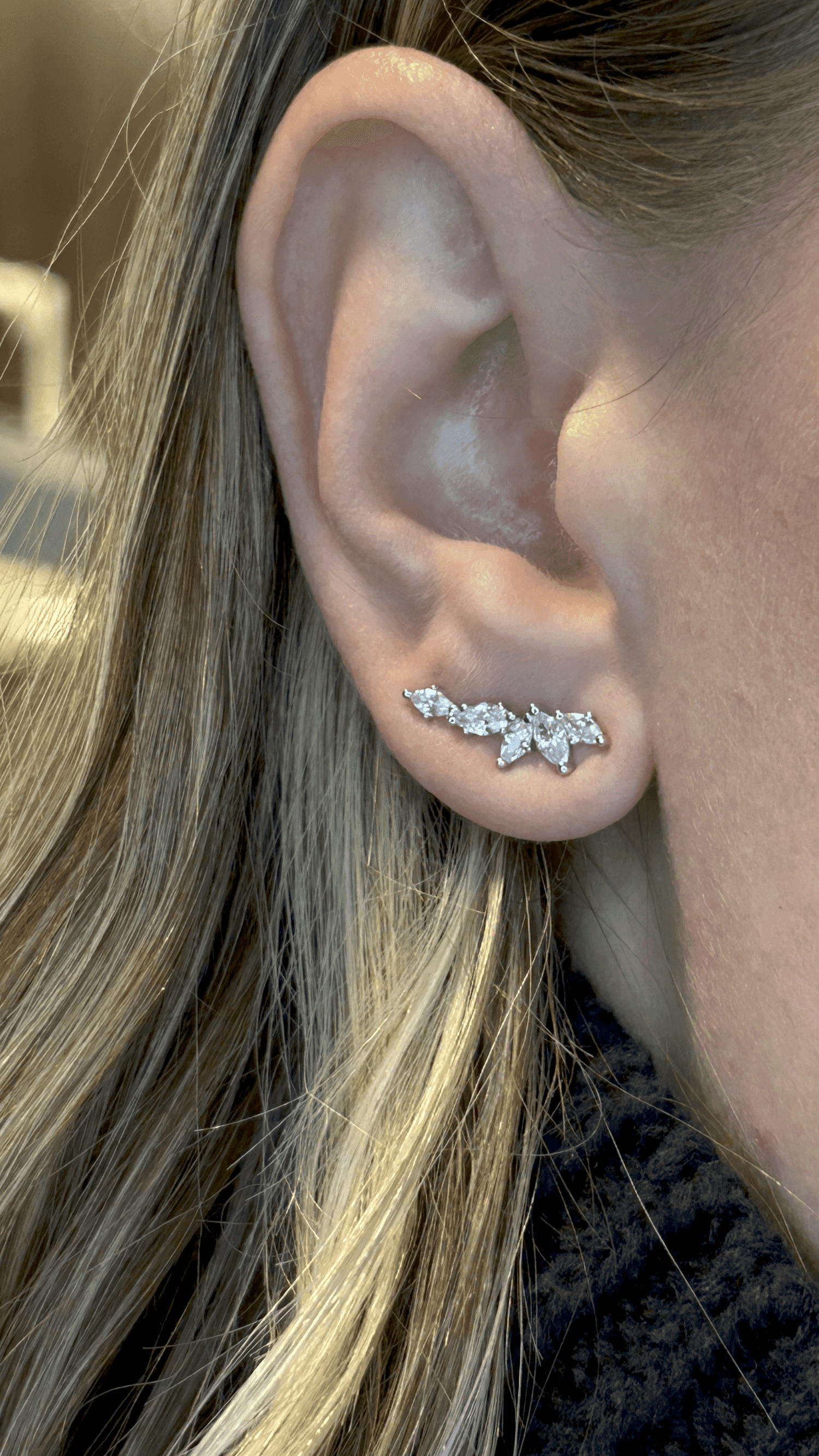 Moderno e sofisticado, este ear cuff combina três navetes posicionadas verticalmente e duas horizontalmente, criando um design geométrico cheio de movimento e charme. Um acessório elegante que reflete luz e personalidade em cada detalhe
