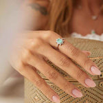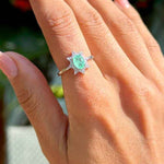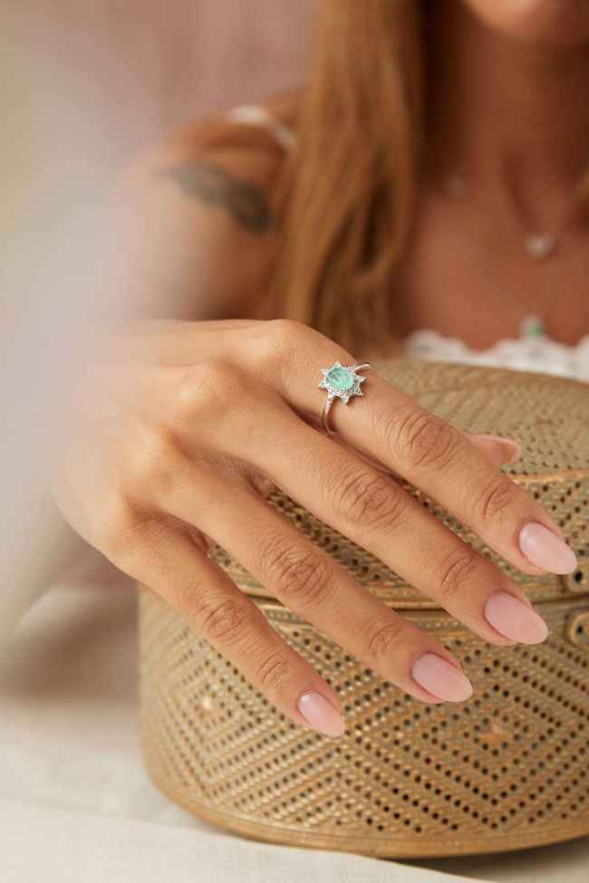 Anel sofisticado com pedra central de esmeralda colombiana fusion em lapidação oval, envolvida por zircônias brancas que realçam sua intensidade e brilho. Uma joia que transmite elegância e feminilidade em cada detalhe.
