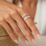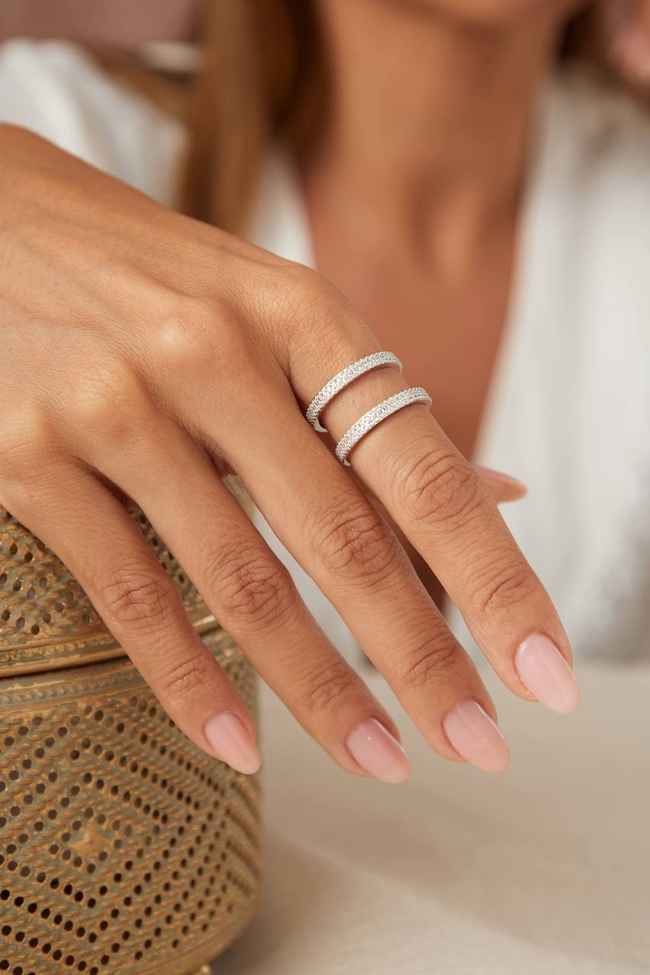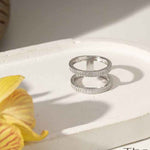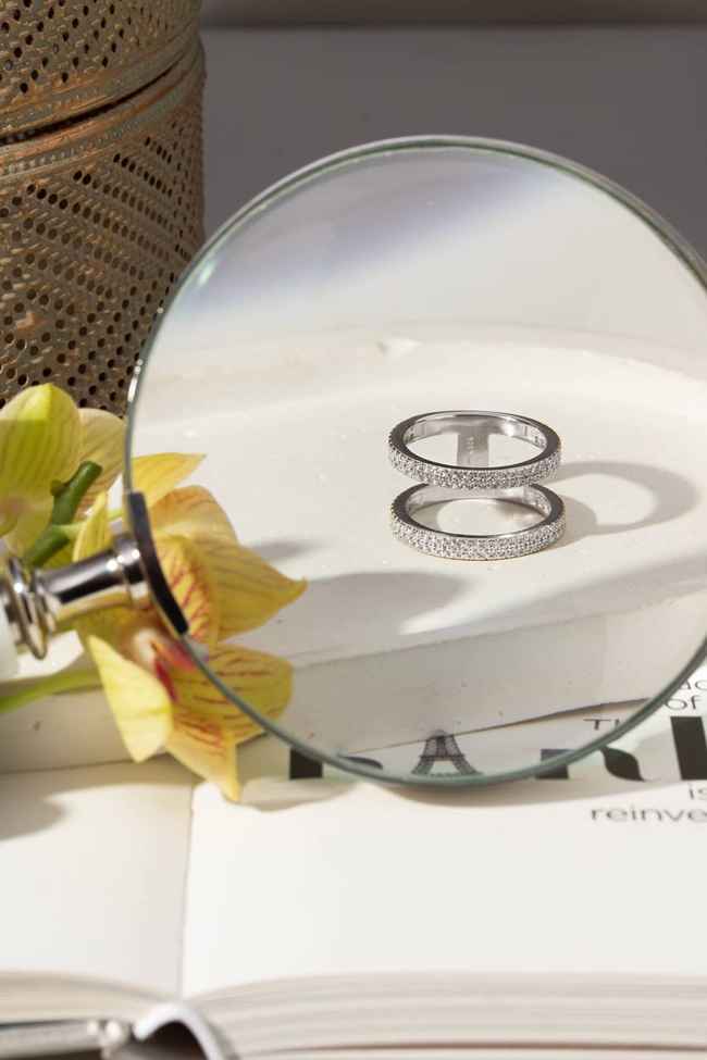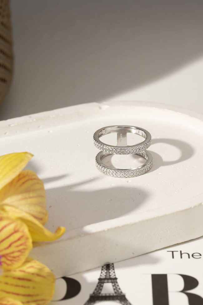 Anel sofisticado com duas linhas paralelas totalmente cravejadas em zircônias brancas, criando um brilho contínuo e elegante. Uma joia moderna que valoriza o detalhe e a delicadeza no design