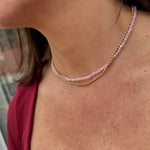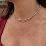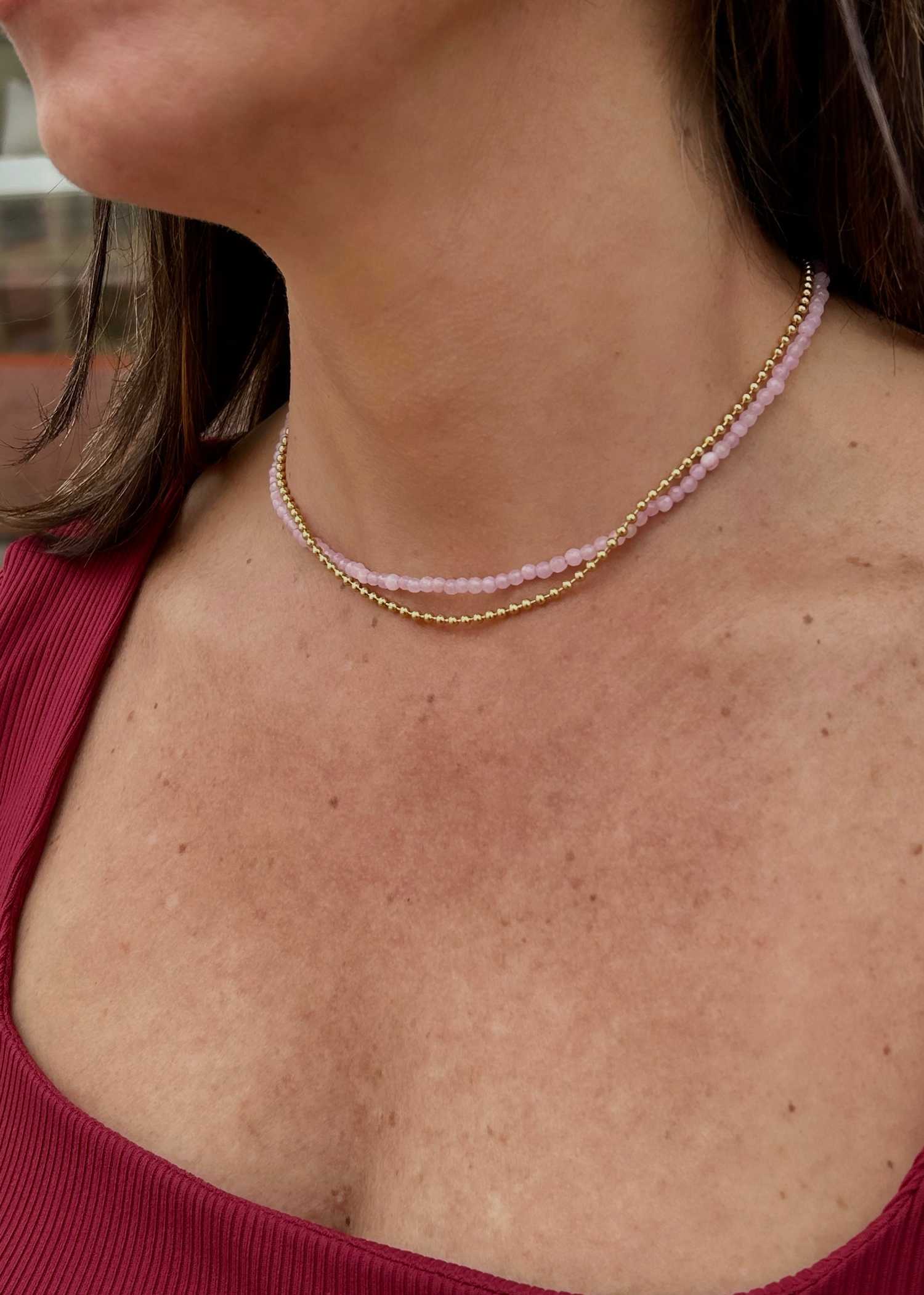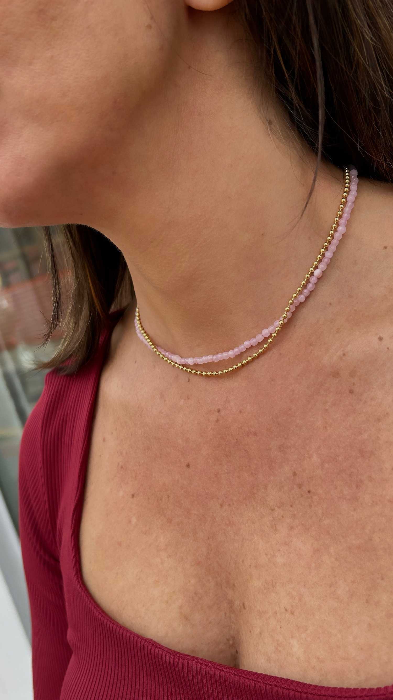 Um design em camadas com um toque de cor. Este colar duplo combina a simplicidade elegante de uma corrente de bolinhas com a beleza suave das pedras de Jade. A justaposição de texturas e o toque de cor das jades criam uma peça moderna e versátil, perfeita para ser usada sozinha ou como base para um mix de colares.