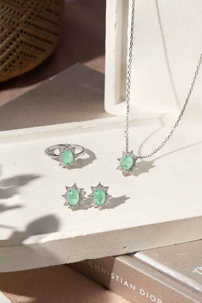 Material: Fusion esmeralda colombiana e zircônias brancas Formato: oval central com borda cravejada Estilo: sofisticado e atemporal